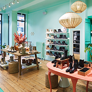 Das Ladenbaukonzept besticht durch einen monochromen Look in Mintgrün mit Akzenten in Korallenrot. Einzelne Ladenbauelemente sind durch raffiniertes Upcycling in Szene gesetzt. Auch Vintage-It-Pieces kommen zum Einsatz und sorgen in den Räumlichkeiten für besondere Fotogenität.